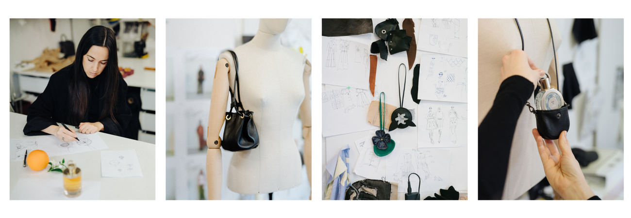 La partie verte symbolise la feuille, tandis que la partie foncée évoque la fleur de violette. Il est fabriqué en cuir d’agneau en provenance d’Italie.